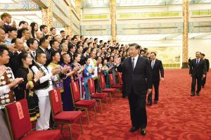 演出開始前,習(xí)近平等黨和國家領(lǐng)導(dǎo)人會(huì)見了文藝會(huì)演演職人員代表、組委會(huì)成員、56個(gè)民族的優(yōu)秀基層黨員代表等,并同他們合影留念。
