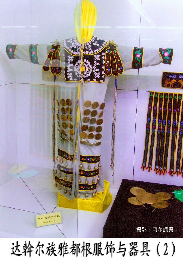 在達斡爾族人部分轉向農(nóng)業(yè)生產(chǎn)后,他們的觀念意識也發(fā)生了一些變化,雅德根服飾隨之有所演變,雙肩的鳥使者為布谷鳥所替代,成為春天的使者,神肩上360個海貝飾品表示360天,24條長短飄帶象征農(nóng)歷的24個節(jié)氣 。