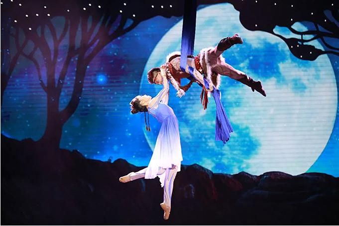 雜技藝術在劇場空間維度的呈現(xiàn),一是把身體作為一種最為本質(zhì)的符號材料進行直接表現(xiàn);二是通過與物體、音樂、舞蹈、燈光、唱詩等的排列組合,展示技藝的身體與物體、空間的關系,達到彰顯其生命意蘊與美學品質(zhì)的目的。劇中網(wǎng)吊、綢吊、轉(zhuǎn)動桿上技巧等項目非常炫技,展現(xiàn)了現(xiàn)代雜技的審美意境,詩與思在舞臺上相得益彰。綢吊極具浪漫色彩,承載著輪回與終極的生命哲理;智者的“唱詩”,凸顯了該劇的史詩特征,增加地域文化和遠古歷史的厚重感。