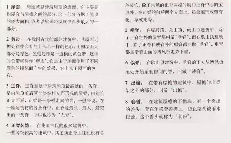 6. 戧脊:在歇山頂建筑中,垂脊的下方從博風板尾處開始至套獸間的脊,叫做“戧脊”。