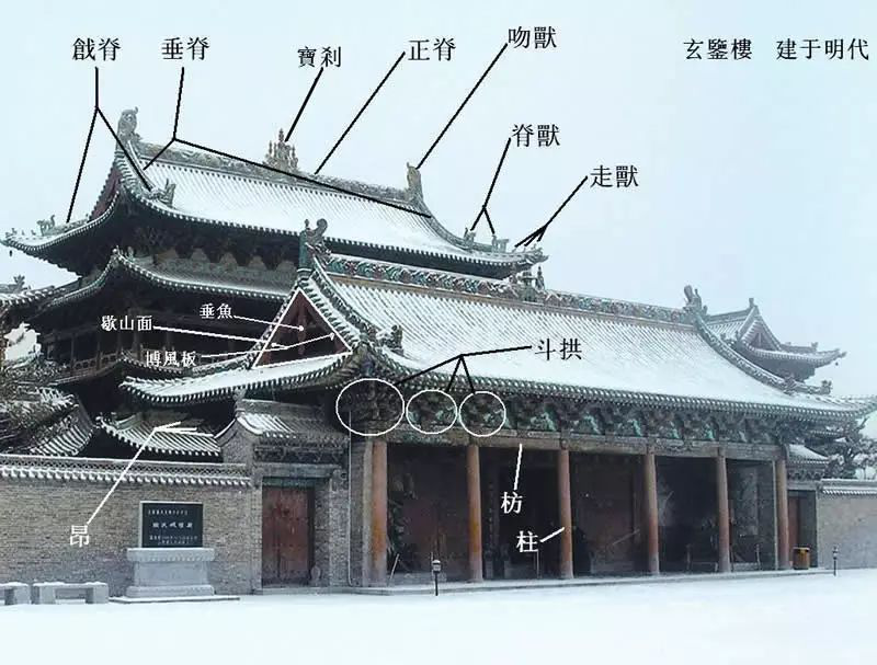 7. 出檐:在帶有屋檐的建筑中,屋檐伸出梁架之外的部分,叫做“出檐”。