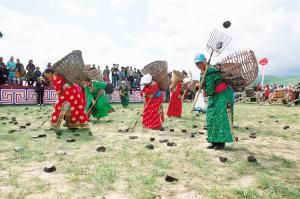 當(dāng)然,后來(lái)那達(dá)慕增加了許多新項(xiàng)目,比如賽駱駝、提水、縫蒙古袍扣子、撿牛糞、打斷牛骨比賽、蒙古象棋比賽、沙嘎(羊拐)比賽等。在北京舉辦的那達(dá)慕里,還融入了現(xiàn)代三大球類比賽項(xiàng)目,為了集體參與,增加了拔河比賽、扔沙包、服飾比賽、兒童說(shuō)蒙古語(yǔ)比賽、兒童唱歌比賽等。