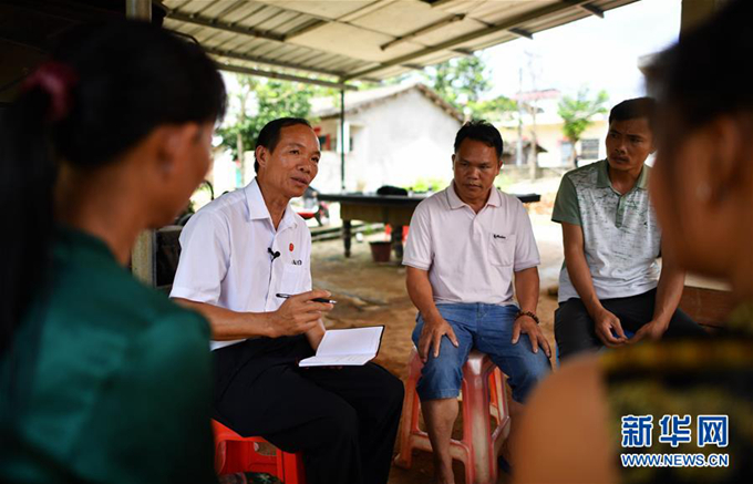 羊風(fēng)極(左)在海南省白沙黎族自治縣打安鎮(zhèn)田表村收集群眾意見和建議