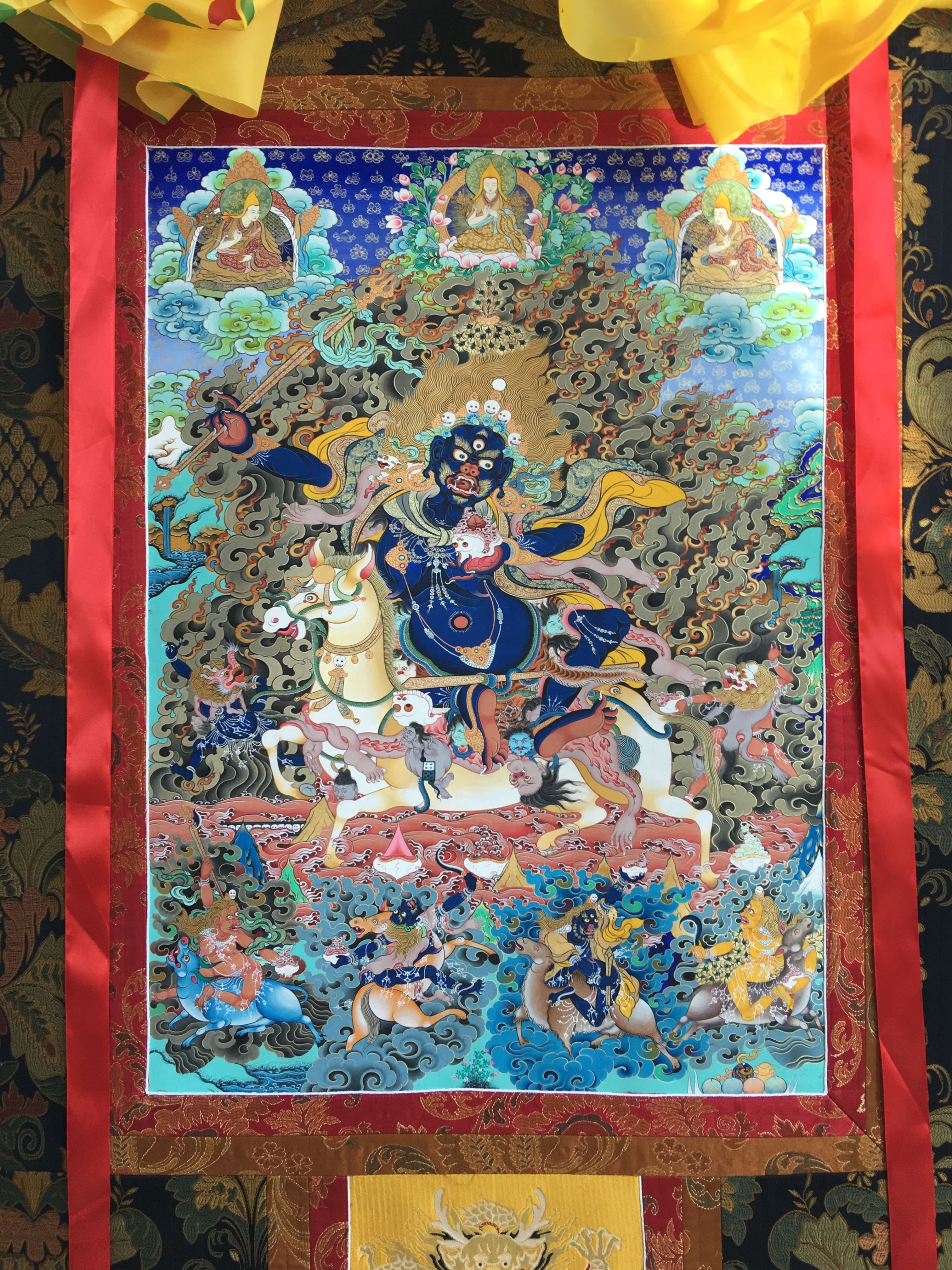 吉祥天母又稱吉祥天女,梵文 Lak?mī,音譯“拉娔詩(shī)米”,藏語(yǔ)稱“班達(dá)拉姆”,是藏密中一個(gè)重要女性護(hù)法神。她是古印度神話中的人物,傳說(shuō)是天神和仇敵阿修羅攪動(dòng)乳海時(shí)誕生的。后來(lái)婆羅門教和印度教把她塑造成女神,為她取名“功德天女”(又稱吉祥天女),說(shuō)她是毗濕奴的妃子,財(cái)神毗沙門之妹,主司命運(yùn)和財(cái)富。后來(lái)她成了佛教的重要護(hù)法神。