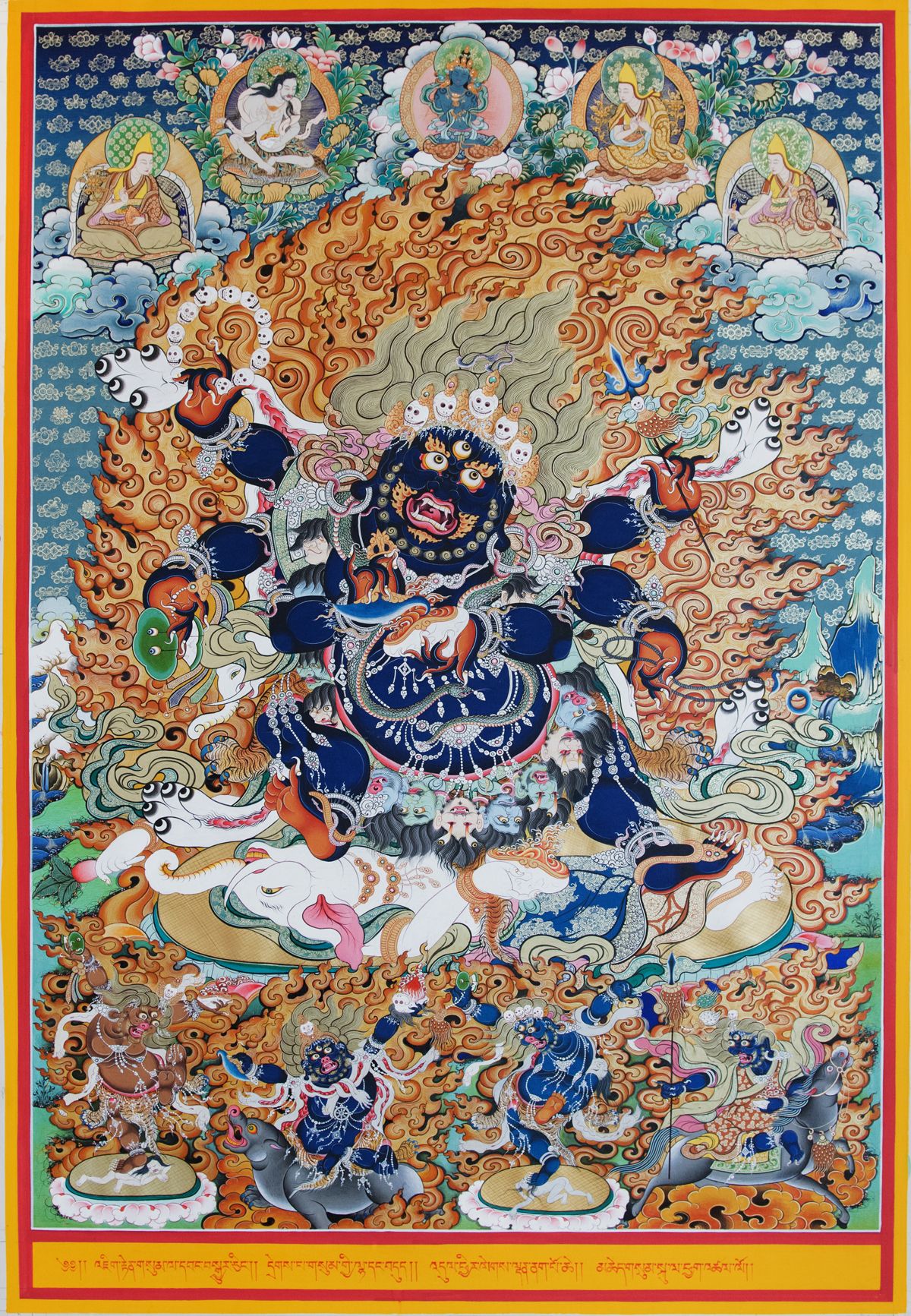 “貢布”護(hù)法神全身青黑,威武神勇,腳踝佩戴著腳鏈以作裝飾,腳下踩著象頭魔,這象頭魔梵語叫毗那耶迦(Vinayaka),后來成為佛教一位財(cái)神護(hù)法。他手里拿著一根白蘿卜,仰臥在蓮花日輪之上,這白蘿卜象征財(cái)富。“貢布”的腰間系著虎皮裙。共有六條手臂,在每條手臂上,都有蛇圍繞,猶如臂環(huán)手鐲一般。右邊三手從上到下分別持彎刀、骷髏念珠和手鼓,左邊三手從上到下依次持盛血顱器、三叉杖和伏魔索。左右最上兩手右彎刀、左顱器置于胸前。