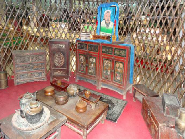亞洲游牧、游獵民族創(chuàng)造的移動(dòng)式民居,在其發(fā)展過程中形成了兩大流派:一種是中國鄂倫春人的傳統(tǒng)建筑歇仁柱式(在鄂倫春語里歇仁柱為“木桿屋”之意),即尖頂、用獸皮或樹皮、草葉子做苫蓋。另一種是蒙古包式的,即穹頂圓壁,主要用毛氈做其覆蓋物。蒙古包的包門開向東南,既可避開西伯利亞的強(qiáng)冷空氣,也沿襲著以日出方向?yàn)榧榈墓爬蟼鹘y(tǒng)。而帳內(nèi)的中央部位,安放著高約二尺的火爐。火爐的東側(cè)放著堆放炊具的碗櫥,火爐上方的帳頂開有一個(gè)天窗?;馉t西邊鋪著地氈,地氈上擺放矮腿的雕花木桌。包門的兩側(cè)懸掛著牧人的馬鞭、弓箭、獵槍以及嚼轡之類的用具。帳內(nèi)的西側(cè)擺放著紅漆彩繪木柜,木柜的北角上敬放著佛龕和佛像,佛像前供放著香爐及祭品。