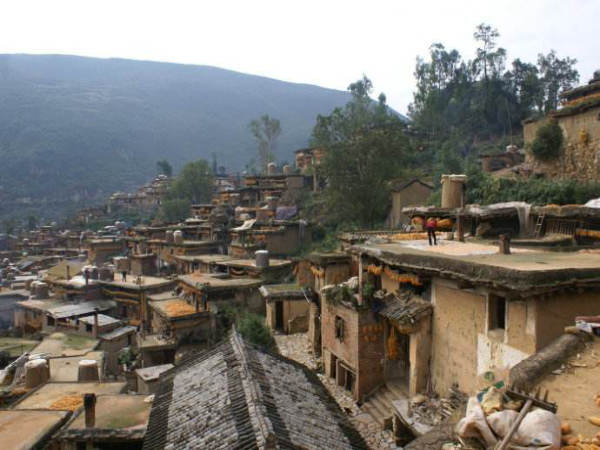 彝族是農(nóng)牧兼營的民族,村寨的分布與坐落有其獨(dú)特的傳承。彝族的村寨多坐落在海拔2000~3000米的山區(qū)、半山區(qū),相沿聚族而居。為適應(yīng)西南地區(qū)亞熱帶氣候和山地特點,彝民們便就地取材,以一種最容易、最節(jié)省錢財人力的建房方式,創(chuàng)造出中國建筑的獨(dú)特樣式——土掌房。土掌房多建于山地斜坡上,以石為墻基,用土坯砌墻或用土筑墻,墻上架梁,梁上鋪木板、木條或竹子,上面再鋪一層土,經(jīng)灑水抿捶,形成平臺房頂,不漏雨水。有的大梁架在木柱上,擔(dān)上墊木,鋪茅草或稻草,草上覆蓋稀泥,再放細(xì)土捶實而成。
