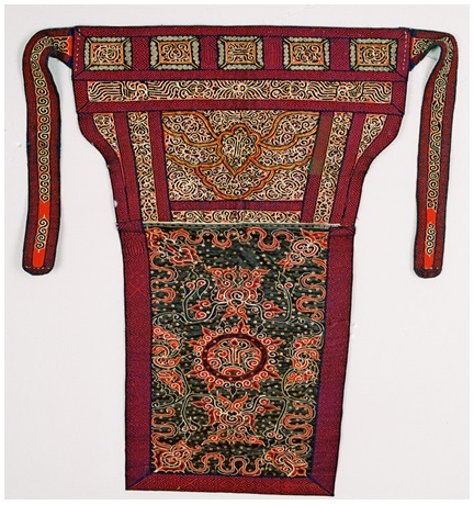 正因馬尾繡的工藝獨(dú)特,蘊(yùn)含著豐富的文化內(nèi)涵,2006年水族馬尾繡入選第一批國家級非物質(zhì)文化遺產(chǎn)名錄。而馬尾繡背兒帶更是將水族馬尾繡的藝術(shù)價值體現(xiàn)得淋漓盡致。民族文化宮博物館所藏的這件馬尾繡背兒帶,刺繡精美,展現(xiàn)了水族婦女嫻熟的刺繡技藝,是研究水族民俗、民風(fēng)、圖騰崇拜等民族文化的珍貴藝術(shù)資料。