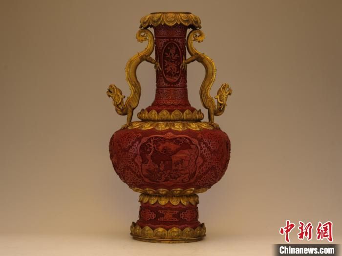 沈陽(yáng)故宮博物館敬典閣館藏珍寶展展廳展出的乾隆款剔紅開(kāi)光山水人物紋龍耳瓶。 沈陽(yáng)故宮博物館供圖