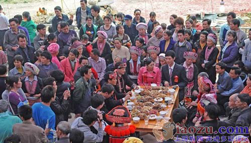 接著就是用美味佳肴盛情款待“親家客”。午餐和晚餐時,新郎方的客人(叫“老房客”)派出代表(男陪女,女陪男)用大碗酒和大塊肉陪“親家客”飲酒吃肉,大有不把“親家客”灌醉不休之雄心。晚宴過后,親朋好友們都會圍著篝火,開始對歌,內(nèi)容大多是對新人的夸獎和祝福,如““十五的月亮明又亮, 小伙子就像月亮一個樣,黑夜里有顆星, 它像姑娘一樣靚,瑤家姑娘作新娘, 美麗得像蝴蝶,新郎也不遜色喲, 如胸前的銀牌一樣閃光輝?!钡鹊取?/p>