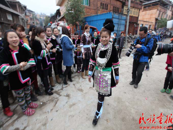 新娘走秀和鬼師做法是婚禮儀式的一項(xiàng)主要內(nèi)容。新娘走秀在第一天上午九時(shí)舉行,這是新娘唯一向眾人展示自己的機(jī)會(huì)也是婚禮中最為隆重的儀式,這時(shí)街心廣場(chǎng)及道路兩側(cè)擠滿了看熱鬧的群眾。之前新娘們都要精心打扮一番,穿上嶄新漂亮的傳統(tǒng)衣裙,戴上各種銀飾,然后在親人的目送下離開家門。新娘走秀與漢族結(jié)婚的迎親有很大不同,沒有新郎伴娘的陪伴,更沒有車水馬龍的迎親隊(duì)伍,只是一人獨(dú)身前行。鬼師做法在新娘登場(chǎng)后進(jìn)行,我們只是見到了鬼師做法后留下的一些物品。