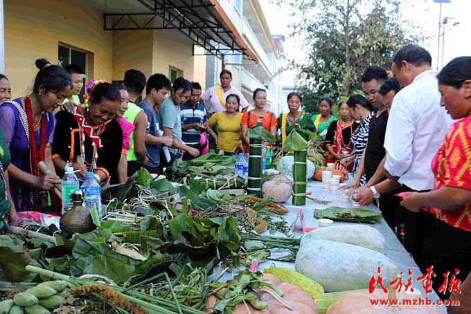 尚立文向記者介紹說:“以前景頗族過年,大年三十,一部分男人在家殺年豬,其余的就上山打獵。景頗族很慷慨,凡是獲取到的獵物,見者都有份。女人除了在家準(zhǔn)備年夜飯,也會上山或下壩子采野菜等。但不管是打獵的還是摘野菜的,都必須在太陽落山前到家,闔家歡度春節(jié)吃年夜飯?,F(xiàn)在生活好了,不打獵不摘野菜了,但還是得遵循太陽落山之前到家的習(xí)俗。”