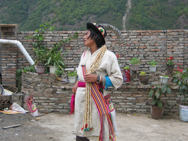 傈僳族男子的服飾各地基本相同、略有區(qū)別,如四川地區(qū)的傈僳男子用黑布包頭,身穿條紋麻布衫褲;云南德宏地區(qū)則頭包黑布,身著無領(lǐng)、無扣的有衽麻布長衫,外罩上灰下黑的小坎肩,前襟無扣,而怒江地區(qū)的傈僳族一般為黑布或紅布、藍(lán)布包頭,身著麻布長衫(夏天穿短衫),褲寬大,長至膝下,上開大襟、無扣,腰系線織布帶等。