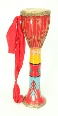 阿昌族的樂器主要有竹琴、洞簫、葫蘆簫(右圖,劉軍攝)、三月簫、銅口弦、三弦、象腳鼓(下圖,蒙哥提供)、铓鑼等。葫蘆簫是用葫蘆連接三根竹管制成的,它有7個音,音量小,音調(diào)低緩圓潤,一般晚上用。三月簫用一根竹管制成,也有7個音,它的音量大,音色細亮,多在白天使用。葫蘆簫和三月簫不僅是阿昌族人民心愛的傳統(tǒng)樂器,還是男女青年傳情示愛的媒介。