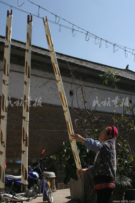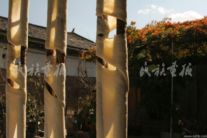 冬日里的一個午后,我來到蝴蝶泉邊的周城村,在一戶白族人家里探訪了乳扇的制作過程。剛到大門口,就聞到一股淡 淡的乳香。走進(jìn)院子,只見一位白族婦女正舉著一根長長的桿子往老高老高的鐵絲上掛,院子里掛滿了一排排白花花的像是裹著白布的竹桿。走近一看,桿子上白白的東西并不是白布,向?qū)Ц嬖V我,這就是乳扇。