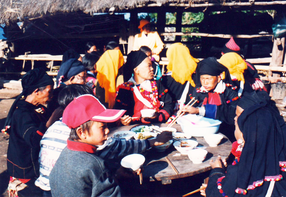 德昂族青年男女結(jié)婚前,都要先舉行認(rèn)親儀式。屆時,男方的親戚如舅父、叔伯等陪同男青年到女方家,用帶去的酒肉糖茶等熱情地宴請女方家人,并分別贈送禮品給女方家庭成員。認(rèn)親過后,女方就請卜卦人選定吉利的日子作為婚期,然后再通知男方家。男方要將彩禮于結(jié)婚前送達(dá)女方家(圖為德昂族女青年,1994)。