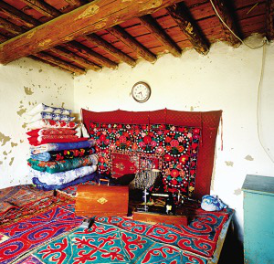新疆維吾爾自治區(qū)木壘縣大南溝烏孜別克民族鄉(xiāng)鄉(xiāng)政府為烏孜別克牧民集中興建了定居房。新村街道整齊,土墻圍成的院落獨(dú)門獨(dú)院。院落很大,前院種菜栽樹(shù),有水井,房后是牛欄羊圈。有的還單建了廂房作廚房。這里的住房都是長(zhǎng)方形土坯平頂房,玻璃窗,墻壁很厚,冬暖夏涼。屋內(nèi)橫梁和走廊的木柱、木梁上有的是工筆重彩的花紋圖案,有的用雕花石膏鑲嵌或磚、木雕刻后鑲嵌,做工精細(xì)。墻壁上有整齊排列的拱形壁龕,里面擺著日用品和工藝品,四周也鑲嵌著花紋圖案。居民們住板炕,在屋里地上挖一小坑,坑內(nèi)放置火爐,鐵皮煙囪通向室外,坑上橫搭木板成板炕,板炕上鋪花氈坐毯??繅σ贿厰[著疊得整齊的被褥,繡花枕頭對(duì)稱地立在被褥上。墻上掛著壁毯,整個(gè)室內(nèi)既有局部美,又有整體美,賞心悅目。