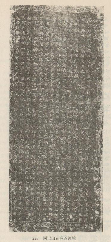 白文碑刻。明楊黼作。景泰元年(1450年)立,原嵌于大理縣作邑鄉(xiāng)慶洞莊圣元寺偏殿前廳北壁,后移至大理縣文化館。碑文14行,陰文正體,從右到左直行書寫。首行為題,其余正文,共13行,每行40字,只第9行41字,末行39字。全詩20節(jié),每兩節(jié)為一聯(lián),共10聯(lián)。前4聯(lián)詠蒼山洱海的自然景色和地勢名勝,后6聯(lián)抒作者之情感。以白語吟誦,優(yōu)美動聽。這是目前保存最為完好的一塊白文碑。傅懋勣、肖雷南在40年代曾根據(jù)郭純?nèi)实淖x音注解此碑,有油印本。石鐘健、楊燦然、徐嘉瑞亦對此碑加以研究。1957年,徐琳、趙衍蓀以郭純?nèi)首x音為本,用國際音標(biāo)記音,并加翻譯?!睹褡逭Z文》1 980年第3期載有釋讀文章。
