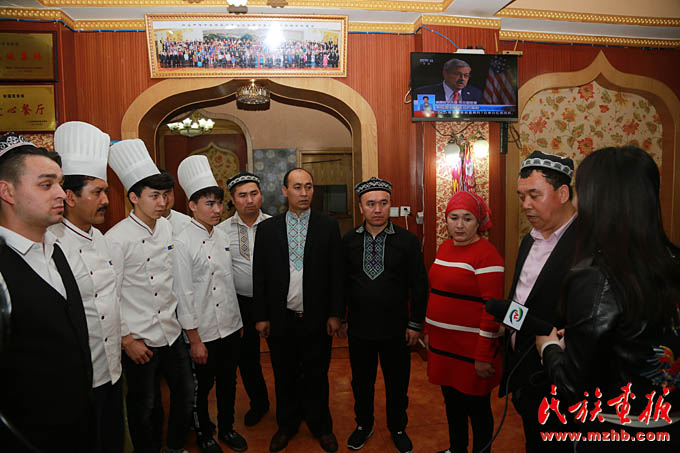 新疆美食城店主阿地力·買買提帶領(lǐng)維吾爾、哈薩克、回族等員工學(xué)習(xí)十九大報(bào)告