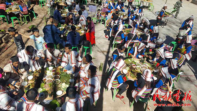 “過去過節(jié),手頭拮據(jù),經(jīng)常是三五戶人家湊錢殺一頭豬。由于物質(zhì)匱乏,節(jié)日前,男女老幼都上山挖野菜,殺豬當(dāng)天,到地里砍芭蕉花,帶上柴火去寨老家里煮年飯吃,節(jié)日第三天去寨老家唱歌跳舞?!?記者聆聽著87歲基諾族老人周白講述基諾山寨的回憶。如今的他已是四世同堂,在耄耋之年能享受天倫之樂,過上幸福生活,他心存感激。節(jié)日當(dāng)天老人們?cè)诖逦瘯?huì)聚餐,席間接受年輕人的敬酒與祝福,其樂融融。