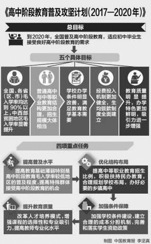 據(jù)中國民族報訊 2017年4月6日,教育部公布《高中階段教育普及攻堅計劃(2017-2020年)》(以下簡稱《攻堅計劃》)。《攻堅計劃》提出,到2020年,全國普及高中階段教育。我國高中階段教育毛入學(xué)率將要達(dá)到90%。