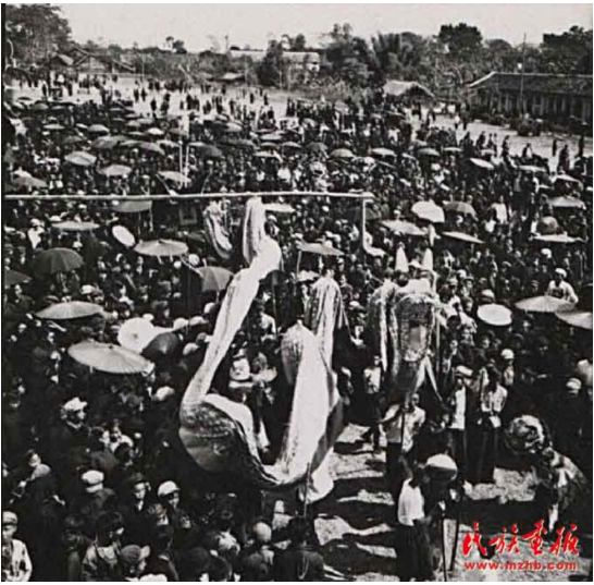 “歌圩”是桂西壯族古老的風(fēng)俗。每年農(nóng)歷正月、二月、四月都有歌圩日。圖為1957年廣西壯族自治區(qū)憑祥市郊區(qū)的歌圩日,這里不但處處歡歌笑語,還有搶花炮、演壯戲、舞彩龍、舞彩鳳、唱桂劇等很豐富的文娛活動