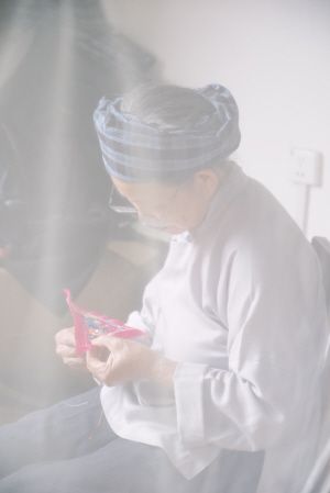 對制衣人來說,她們?nèi)缗e行儀式般專注著染布、成衣,或許也在這個(gè)過程中積攢起許多專注和深情。一位有十幾年經(jīng)驗(yàn)的阿姐曾告訴我:“做這衣服要有一顆溫柔的心。”聽時(shí)深深一顫,而用黃奶奶樸素的話,則是“染布高興”。