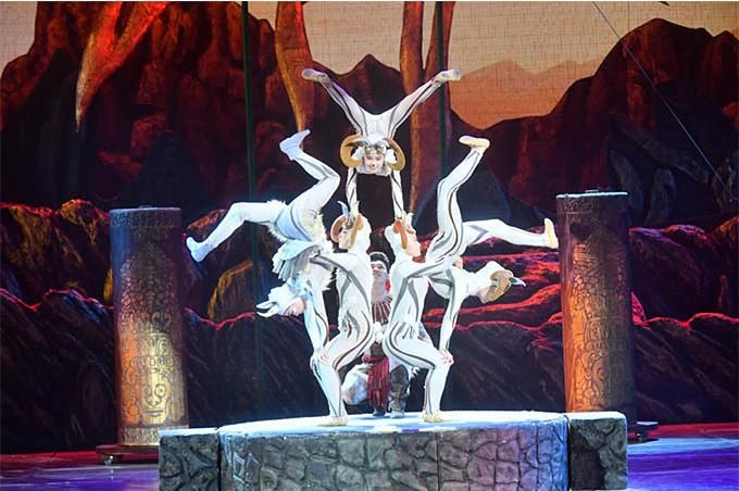 《巖石上的太陽》挖掘?qū)幭谋就廖幕夭模月劽谑赖馁R蘭山巖畫為創(chuàng)作主題,將非物質(zhì)文化遺產(chǎn)用雜技藝術(shù)的形式再現(xiàn)出來,填補(bǔ)了寧夏歷史上大型原創(chuàng)雜技劇的空白。