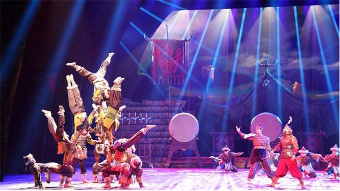 雜技成為劇目的加分項(xiàng)。雜技節(jié)目是新疆生產(chǎn)建設(shè)兵團(tuán)雜技團(tuán)的拿手好戲,但主創(chuàng)團(tuán)隊(duì)在編創(chuàng)時(shí),并沒(méi)有將該團(tuán)過(guò)去的金獎(jiǎng)節(jié)目直接照搬,而是根據(jù)劇情巧妙地進(jìn)行了取舍,將原先完整的雜技節(jié)目分解成一個(gè)個(gè)獨(dú)立的動(dòng)作技巧,根據(jù)主題表達(dá)、人物塑造、情節(jié)起伏、矛盾變化等劇情發(fā)展需要進(jìn)行重新整合,使雜技獨(dú)特的個(gè)性在表演中發(fā)展為主題性、戲劇性、語(yǔ)言性的藝術(shù)。用集體倒立技巧表現(xiàn)沙漠中千姿百態(tài)的胡楊造型;用急促迅捷、富于變化的繩技表現(xiàn)戰(zhàn)爭(zhēng)中策馬揚(yáng)鞭、軍情緊急的場(chǎng)面;用女子集體造型表現(xiàn)宮廷夜宴時(shí)的曼妙繁盛、歌舞升平等……雜技元素在劇中的巧妙運(yùn)用,成為全劇錦上添花的亮點(diǎn),體現(xiàn)出“有舍才有得”的大智慧。