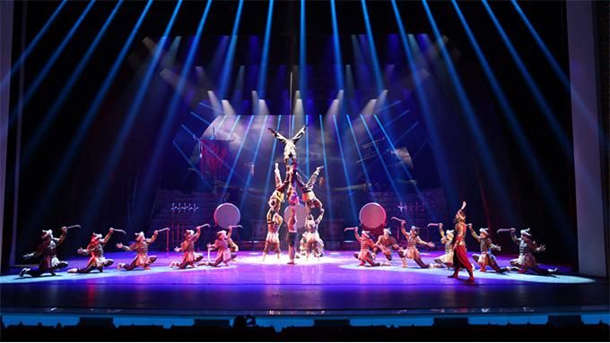 雜技是這部劇的一大亮點(diǎn)。新疆生產(chǎn)建設(shè)兵團(tuán)雜技團(tuán)近年來(lái)編創(chuàng)了《天鵝湖—男子倒立技巧》《向太陽(yáng)—繩技》《春之韻—女子造型》等多個(gè)精品節(jié)目,并在國(guó)內(nèi)外重大雜技賽場(chǎng)多次獲獎(jiǎng)?!稑翘m尋夢(mèng)》中,主創(chuàng)團(tuán)隊(duì)將這些獲獎(jiǎng)節(jié)目進(jìn)行拆解,將蹬鼓、獨(dú)輪車、吊環(huán)、肩上芭蕾、水流星及舞中幡等雜技技巧與戲劇元素相融合,讓觀眾猶如置身于黃沙漫漫的絲路古國(guó)。