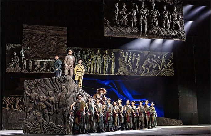 在舞蹈語(yǔ)言的設(shè)計(jì)上,編導(dǎo)融入當(dāng)代元素,使觀眾不但感受到審美的親切與現(xiàn)代感,而且還自然地進(jìn)入回望歷史的情境,對(duì)其思想內(nèi)涵的理解更為準(zhǔn)確。該劇的道具使用和調(diào)度也頗為大氣,令人印象深刻。一組斜坡?tīng)畹拇笮臀枧_(tái)道具不但由群眾演員直接移動(dòng)而實(shí)現(xiàn)即時(shí)的場(chǎng)景調(diào)度,還可使演員上下和左右而行,最終組合成巨大的中國(guó)共產(chǎn)黨黨徽,輔助完成了人民英靈和英雄的形象塑造。