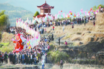 正月十五元宵夜,福建龍巖姑田鄉(xiāng)村,大龍翔游,看客云集。二百多節(jié)、千米長的大龍,蜿蜒于鄉(xiāng)間村野,穿行于大街小巷,騰挪起伏,活靈活現(xiàn);一路上男女老少趨之若鶩,前后左右相隨,游龍隊伍浩浩蕩蕩達數(shù)里之長,熱鬧非常;所到之處,家家門前燃松明、點香燭、擺果茶、放爆竹,迎接“龍游大地,喜到人間”。