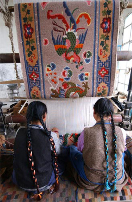 從前,“措巴”每年都要派人去拉薩專為達(dá)賴?yán)锖偷胤秸幙椏▔|以及其他羊毛織品。十三世達(dá)賴?yán)锿恋羌未霑r(shí)期,江孜織工索朗多布杰手藝高超,曾為達(dá)賴?yán)锟椓穗p龍靠墊、凈水瓶袋等著名織品,被封為五品官。民主改革后,江孜卡墊業(yè)在中央政府的關(guān)懷下又有了新的發(fā)展,他們編織的“布達(dá)拉宮”、“珠穆朗瑪”、“萬里長(zhǎng)城”等壁毯和地毯,是享譽(yù)國(guó)內(nèi)外的精品。