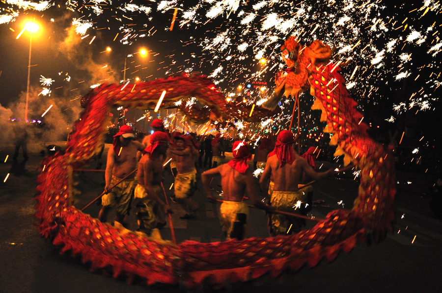 全國的舞龍有上百種,經(jīng)過幾千年的流傳和發(fā)展,其表現(xiàn)形式更是多種多樣。最為普遍的叫“火龍”,舞火龍的時候,常常伴有數(shù)十盞云燈相隨,并常常在夜里舞,所以“火龍”又有一個名稱叫“龍燈”。耍龍燈的時候,有幾十個大漢舉著巨龍在云燈里上下穿行,時而騰起,時而俯沖,變化萬千,間或還有鞭炮、焰火,大有騰云駕霧之勢,下面簇擁著成百上千狂歡的人們,鑼鼓齊鳴,蔚為壯觀。