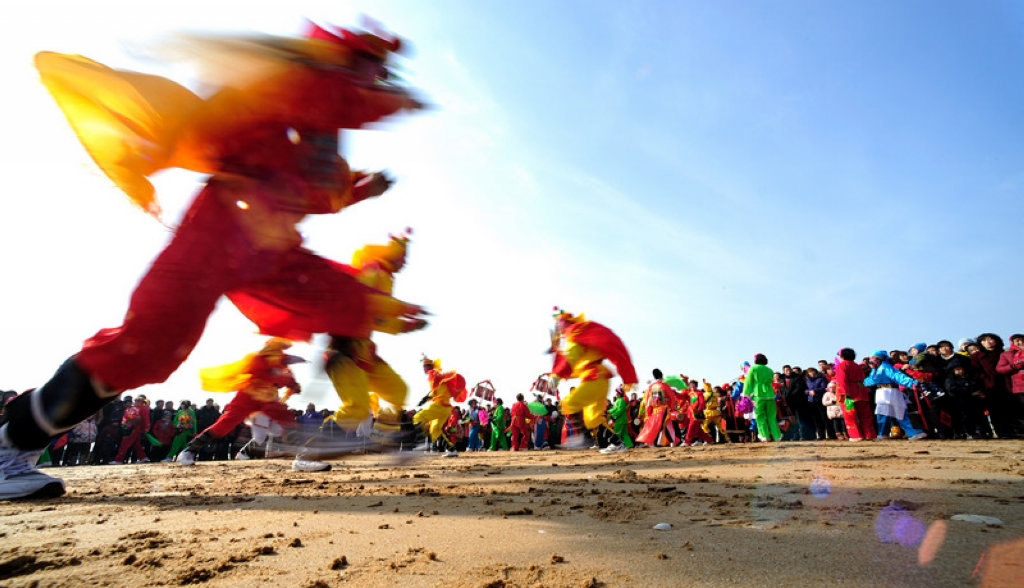 秧歌是春節(jié)群眾歡慶活動中,起著承前啟后、烘托氣氛的大型歌舞形式。這里所指的“秧歌”不僅是單一的“秧歌舞”,而是包含著數(shù)十種歌舞形式所組合的文藝演出隊伍。這支隊伍既要在走街串巷中做行進表演,又將最后集中于廣場做正式的歌舞演出。因此在北方,人們索性就把過去有著祭祀色彩,而今完全成為春節(jié)娛樂式的民間文藝形式稱為“社火”或“秧歌”,把這支浩蕩的隊伍統(tǒng)稱為“秧歌隊”。秧歌隊最前方,在高舉象征來年風調(diào)雨順大傘的藝人率領下,“龍舞”“獅舞”舞隊位列隊首;接下來是一組手揮彩綢翩翩起舞,走“雙葫蘆”“繞菠花”各種圖案的“大場”表演隊;然后是腰間橫挎紅色腰鼓、踏著激越鼓聲的“腰鼓隊”,表演著令人眼花繚亂的“回頭望月”等套路;再后面是腰系竹馬或旱船,扮演新郎送媳婦回娘家的“跑驢”或“跑旱船”;接著是腳踩丈八高蹺、穿戲裝、彩繪臉譜的“高蹺隊”。接下來還有名為《火盆架子》的隊伍,那是把冬季用于取暖的炭盆架,用繩子將其高于腳面懸掛在肩上。盆架以綢布、花草裝飾,表演者戲裝打扮,表演一段段膾炙人口的戲曲節(jié)目。他們被歡天喜地、熙熙攘攘的人們擁簇著一同前往最后進行表演的廣場。由各個村鎮(zhèn)陸續(xù)舉行的這種熱烈而歡騰的歌舞慶祝形式,將貫穿在整個春節(jié)期間,直到正月十五“燈節(jié)”。