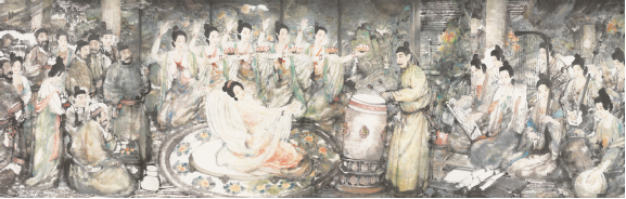 劍器舞也有著悠久傳統(tǒng),早在春秋戰(zhàn)國時(shí)代,孔子的學(xué)生子路,戎裝見孔子,曾拔劍起舞。學(xué)生拜見老師舞劍,當(dāng)然只是表演技藝,是對老師致敬的意思。湖北隨縣戰(zhàn)國初期曾侯乙墓出土的鴛鴦盒上的樂舞圖案中,鼓旁的舞者腰間掛著短劍,說明劍舞可能是當(dāng)時(shí)頗為流行的一種舞蹈形式。楚漢相爭時(shí),劉邦、項(xiàng)羽宴于鴻門,項(xiàng)莊說:“君王與沛公飲,軍中無以為樂,請以劍舞?!表?xiàng)羽表示同意,于是項(xiàng)莊拔劍起舞,逐漸靠近劉邦,企圖借機(jī)殺死劉邦,在場的項(xiàng)伯見劉邦危急,也以劍伴舞,保護(hù)劉邦不被項(xiàng)莊殺害。這個故事表明,當(dāng)時(shí)筵宴中有舞劍作為助興表演的風(fēng)俗。唐代,杜甫作《故武衛(wèi)將軍挽歌三首》,有“舞劍過人絕”句??梢姰?dāng)時(shí)許多人會舞劍,而且各有絕招。公孫大娘最為擅長的《劍器舞》,是《裴將軍滿堂勢》。杜甫曾觀其舞,并寫了《觀公孫大娘弟子舞劍器行》一詩,觀者如山,可見此舞技巧之高。