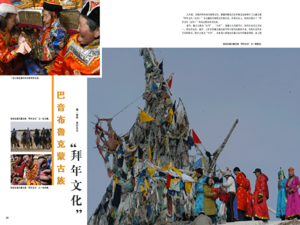 幾年前,為保護(hù)和傳承非物質(zhì)文化,新疆和靜縣巴音布魯克總場舉行了以蒙古族“拜年文化(過年)”為主題的非物質(zhì)文化展示會。在展示會上,牧民們展示了“拜年文化(過年)”的全過程及有關(guān)禮俗。