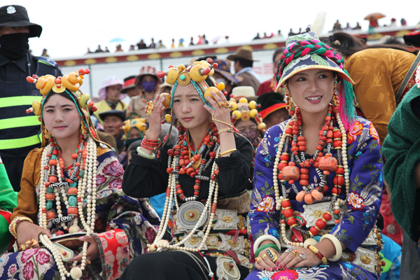 甘、青、川的藏族男子非常講究腰飾,有財(cái)力的男子一般都有一條鑲有僅、銀、玉的寬皮腰帶,腰帶上還掛有裝飾性的小刀、火鐮等。青海玉樹地區(qū)的婦女裝追求華麗,內(nèi)衣外袍色彩艷麗,綢緞腰帶留長(zhǎng)飄帶,頭、頸、發(fā)、腕、指和腰佩有金、銀、玉、珊瑚、瑪瑙等珍貴飾品,一套豪華女裝價(jià)格不菲。因此有諺語:“男人的財(cái)富系在腰上,女人的嫁妝穿在身上”之說。云南藏區(qū)的女裝上身穿長(zhǎng)袖彩綢衫,外著無袖大襟長(zhǎng)袍,長(zhǎng)袍領(lǐng)口、襟邊和下擺鑲有錦緞,色彩艷麗。云南一些藏區(qū)的女子喜歡穿百褶裙,顯示出女性的優(yōu)美身材。西藏工布地區(qū)的女裝顯得簡(jiǎn)約,先穿有袖內(nèi)衣,再將氆氌拚縫成大片,中間挖一圓口,穿時(shí)將頭伸進(jìn)圓口兩端垂與胸背,再束腰帶即可。藏族婦女的頭飾也很多,有碎辮的、有戴頭巾的,有盤發(fā)的,西藏山南地區(qū)的巴珠最有特點(diǎn)。巴珠是三枝狀,平系于頭頂兩枝向前,將分梳的兩條發(fā)辮分別盤于兩枝上。其上部還有一弓形物,與三枝狀兩端連接,上系絲織品,邊緣鑲珍珠、珊瑚等。女子13歲戴巴珠,象征已經(jīng)成人。金邊帽也很有特色,藏區(qū)的男女都戴。帽型為桶狀,周邊鑲織錦,內(nèi)有四片耳片,兩大兩小,天冷時(shí)放下耳片護(hù)耳。狐皮帽形似倒掛的金鐘花,以布作底層,再縫上狐貍皮,帽后有兩條長(zhǎng)飄帶。男帽稍高,女帽較低。