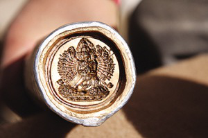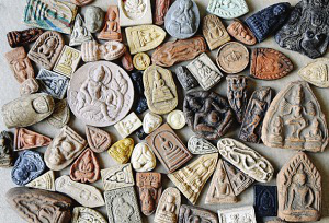 我在曼谷一家有40年歷史的佛像店“佛光工藝社”采訪時問到老專家這樣一個問題:泰國現(xiàn)在大概有多少種圖案的帕肯?所有聽到這個問題的人都是一聲驚嘆,然后笑說:“無數(shù)!”我非要問出個數(shù)來,他們便告訴我,泰國是一個歷史劃分復雜、族源廣博的國家,因此其包容性很強,雖然九成以上的人信仰佛教,但是婆羅門教、道教、伊斯蘭教、基督教等在泰國都被接納,還有本土的一些法術也不曾被丟棄。所以,每天每個來定做的人都會有不同材質(zhì)的要求,不同圖像、符咒的組合,僅一個工藝社40年來就已經(jīng)做過幾十萬種的圖案組合。我收藏的擦擦有不同年代、不同材質(zhì)、不同價值的,除去年代久遠的,頗有價值的就是一個藥擦,那是一個大威德金剛擦,專家說從被剝落的剖面看,里面有藥材的成分。我知道,在西藏,擦擦因材質(zhì)和制作人不同而有很大的區(qū)別。擦擦中最為稀有難求的一種叫“布擦”,那是寺廟僧人在保存活佛法體的時候,將那些浸透活佛法身血水的鹽巴或其它藥物和泥土融合后制成的。另一種較為珍貴的擦擦是活佛的骨灰與泥土摻混在一起制作而成的。還有一種藥物擦擦,是用不同的名貴藥材如珍珠、瑪瑙、藏紅花等藏藥合成制作,可服用治病。最普通的擦擦用一般的泥土制作,好一點的有膠泥、陶土、白泥等,這種擦擦成本低廉,在民間流傳最廣。
