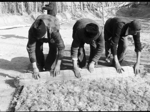 這時,亞生已經(jīng)開始了第二步,他把彈好的羊毛鋪勻,開始噴灑開水。只見他熟練地把水噴向羊毛,然后和妻子一起快速把簾子卷好,用羊毛繩綁緊,再用腳踏著卷好的簾子在平地上來回踏蹬,這樣不停地重復(fù)后,做成了氈坯。亞生停下來解開簾子,拉平氈坯,修整好邊角,又灑上熱開水,把氈坯卷起,這是工藝最關(guān)鍵也是最后一步——他們一起跪在簾上,用雙臂反復(fù)搓滾氈坯,感覺已經(jīng)平整了,夫婦倆又齊心協(xié)力把氈坯展開拉平,放到院子里。此時,亞生長出了一口氣,抹抹頭上的汗說:“晾干了就可以賣了!”