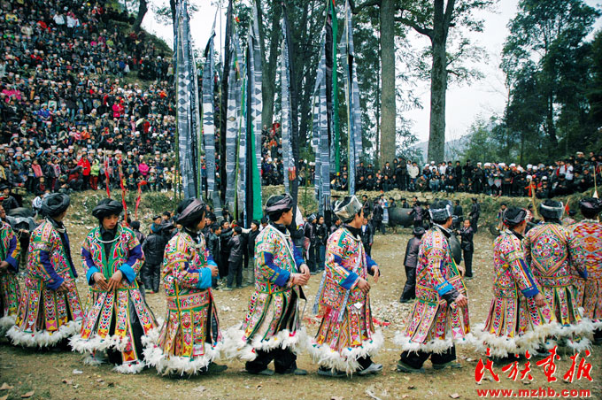 苗族的歲時節(jié)慶獨特鮮明。傳統(tǒng)節(jié)慶按功能可分為:物質(zhì)交流節(jié)慶;男女社交、戀愛、擇偶節(jié)慶;祭祀性節(jié)慶;紀念性、慶賀性節(jié)慶。