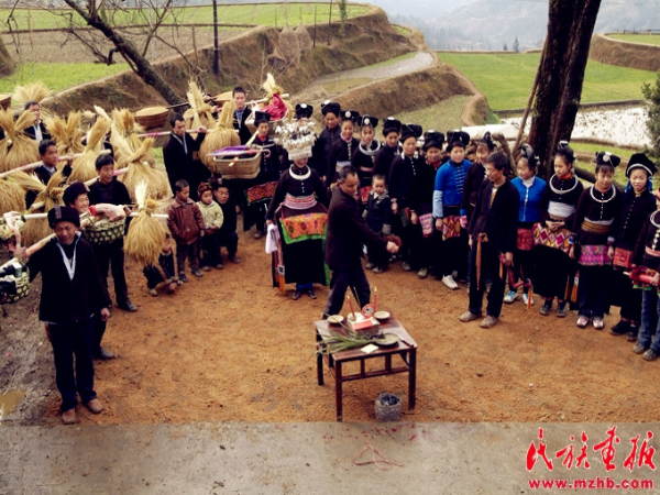 送親隊(duì)伍來(lái)到新郎家的寨口,寨老為新娘主持“回喜神”儀式