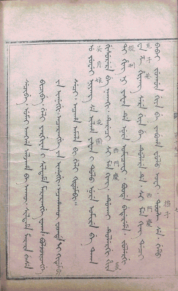 滿文本《金瓶梅》國內(nèi)藏有國家圖書館刊本、中央民族大學圖書館刊本、趙則誠先生藏刊本(殘)、中國社科院民族研究所刊本(殘)、大連圖書館抄本、吉林大學圖書館精抄本、中國民族圖書館刻本等。此外北平闞君云敝處所藏有蒙文《金瓶梅》。
