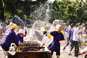 “扁水”是當?shù)胤窖?,為戲水、潑水之意。“扁水”狂歡節(jié)源于侗族“為也”習(xí)俗,為做客之意,指村寨之間村民們的互相訪問,是當?shù)匾?guī)模最大的社交和娛樂活動?!盀橐病睍r,當?shù)囟弊迦罕姂蛩?、潑水狂歡,久而久之就形成了“扁水”狂歡節(jié)。