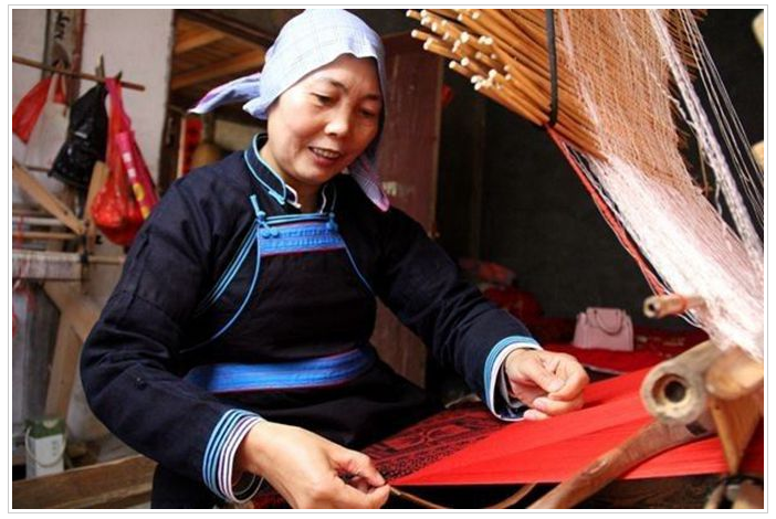 粟田梅12歲開(kāi)始隨母親研習(xí)侗錦,15歲已能獨(dú)立完成整經(jīng)、穿扣等系列編織技藝,16歲掌握復(fù)雜的“八十八紗”紡織技術(shù)。在粟田梅靈巧的手指間,可以編織出具有濃郁侗族文化特色的蘆笙、鼓樓、風(fēng)雨橋等圖案。憑借精湛的侗錦紡織技藝,粟田梅2009年入選國(guó)家級(jí)非遺代表性傳承人。
