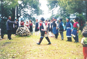 活動的最后一套儀式,便是送藥和摸荷包。所謂送藥,即人們把自己認(rèn)為最好的藥草,用紅頭繩拴捆成束,唱著祝福歌相互贈送。摸荷包即把各人的雙眼用手帕遮住,讓他(她)唱著《許愿歌》,去摸取一個系在活動場地四周那些插著的花枝上的荷包。據(jù)說,摸到荷包,就表示能夠得到藥仙的佑護(hù),終生不會生病。