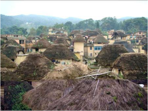 哈尼族一個(gè)核心的家庭的一幢完整的磨菇房,包括正房、左右?guī)?、庭院和圍墻等?shù)個(gè)建筑單元,家中配有腳碓、石磨、水缸、織機(jī)、藍(lán)靛染缸、犁、耙、刀、斧、鋤、籮和火塘等生產(chǎn)生活設(shè)施,滿足作為社會(huì)生產(chǎn)和生活單位的家庭的諸多需求。若干家庭的磨菇房逐次排列,就逐漸變成了一個(gè)哈尼族山寨的磨菇房群落。
