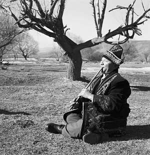 哈薩克老人在吹奏斯布孜額