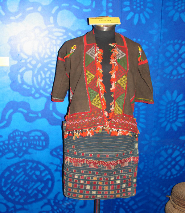 在服飾工藝方面,秦漢時期,黎族先民已有了原始的服飾。當時最流行的一種服裝是“貫”和“穿胸”,即貫服或貫頭服?!短接[》卷七九○引《異物志》載:“穿胸人,其衣則縫布二尺,幅合二頭,開中央,以頭貫穿胸不突穿?!薄稘h書·地理志》也記載:“(海南島)民皆服布如單被,穿中央為貫頭。”2000多年以后,這種衣服在黎族潤方中仍保留下來。