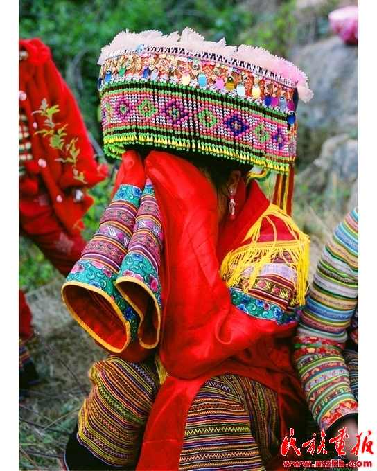 刮臉回來后,張正秀就由姐妹陪伴在閨房。屋外送親的酒席在熱鬧中開席時,舅母就回到閨房里為她洗臉洗腳,改換嫁衣。按傳統(tǒng)習俗,要把新娘用過的水潑灑在閨房的地上,以示吉利。新娘穿上由親人縫制的繡花衣裙,從頭到腳煥然一新。穿戴整齊后,新娘由伴娘陪同坐在閨房門旁的草地上接受祝福。女方家請的懂禮儀的阿巴莫(司儀)手持菜花和松針葉在堂屋敬女方家神,告訴家神姑娘要出嫁了,并給前一天夜里來新娘家領親的兩位娃拿扒(證婚人)挎上兩條交叉打結(jié)的紅布,表示娃拿扒已承諾為女方家領親。